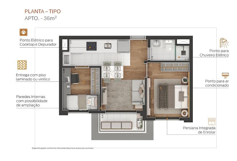 Apartamentos 36 metros 2 dormitórios e 2 todos com varanda.